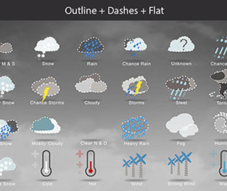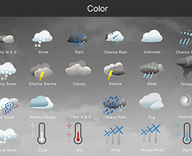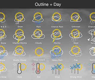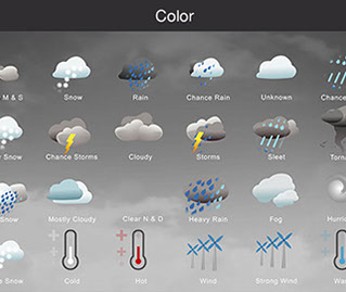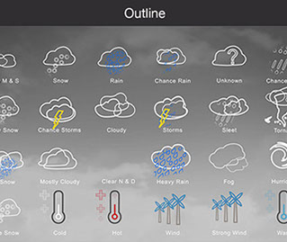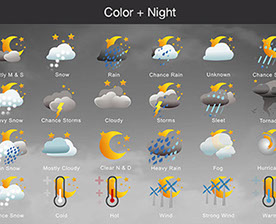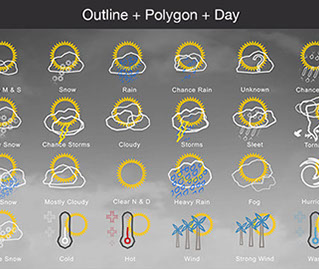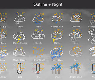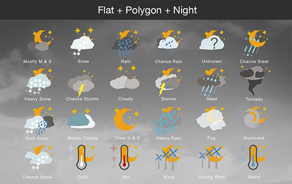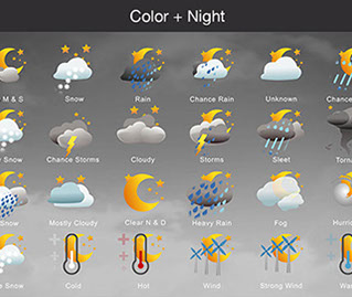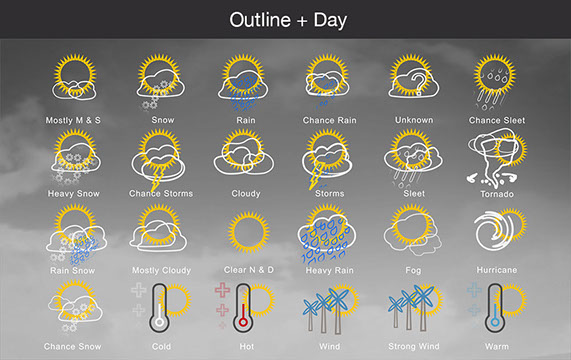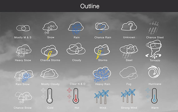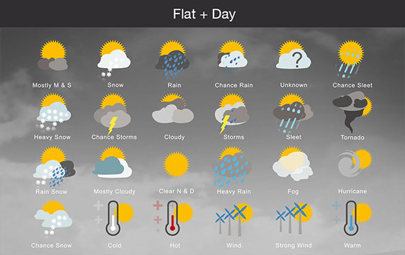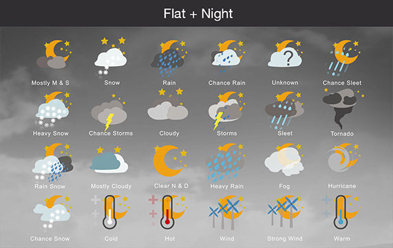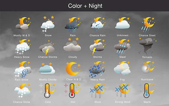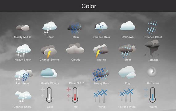 Mostly Sunny, Snow, Rain, Chance Rain, Unknown, Chance Sleet, Heavy Snow, Chance Storms, Cloudy, Storms, Sleet, Tornado, Rain Snow, Mostly Cloudy, Clear & Sunny, Heavy Rain, , Fog, Hurricane, Chance Snow, Cold, Hot, Wind, Strong Wind, Warm, and many other useful icons.